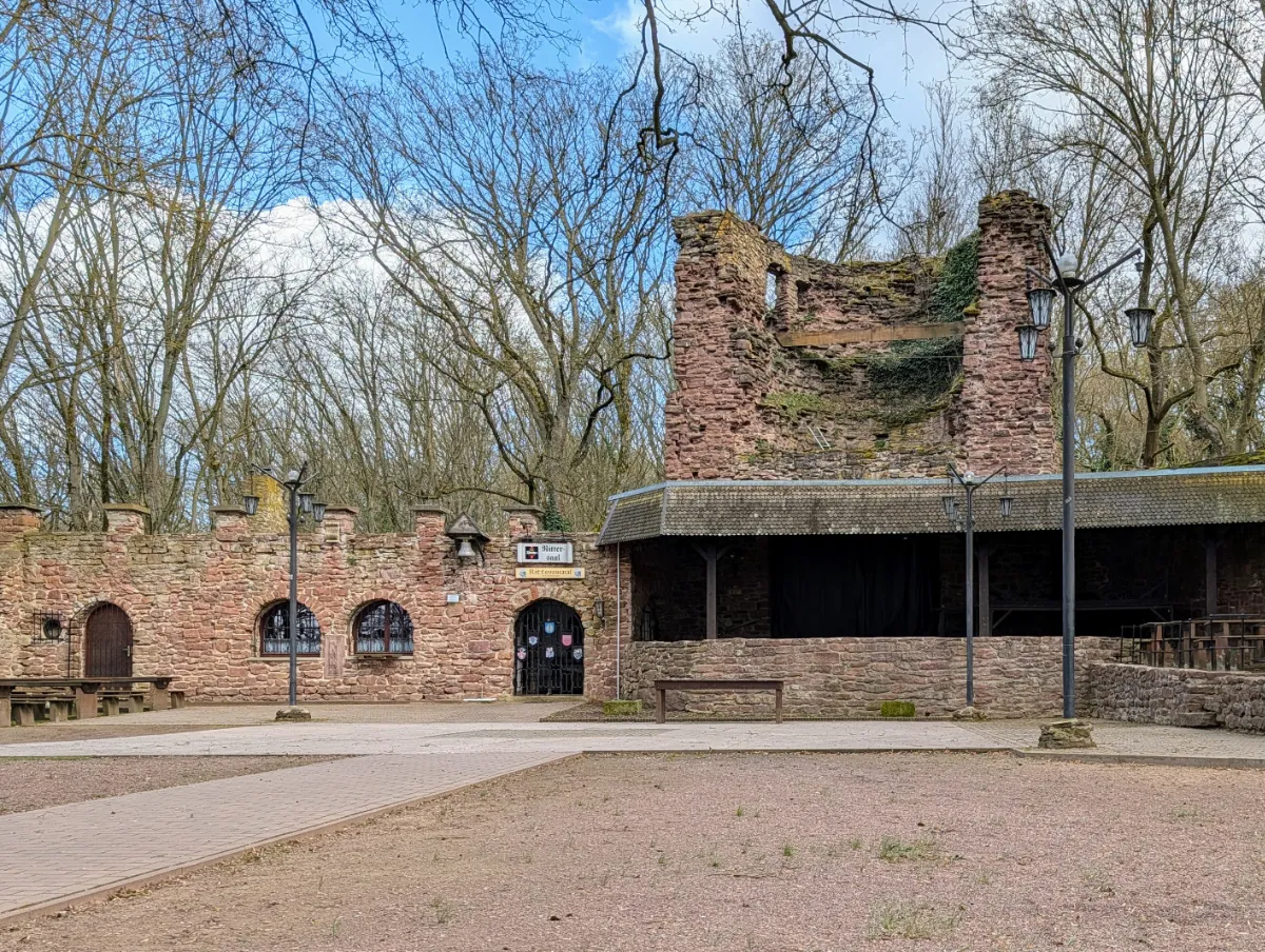 Ein 30 Meter hoher Bergfried aus rotem Sandstein, blauer Himmel dahinter, und im Vordergrund eine alte Mauer mit Flechten und Moos. So stand das vor uns, als wir Ende März die Burgruine Bornstedt erreichten. Die Bäume noch kahl, das Gras schon grün, die Sonne warm genug, um sich eine Weile hinzusetzen. Ein guter Tag für eine Ruine.