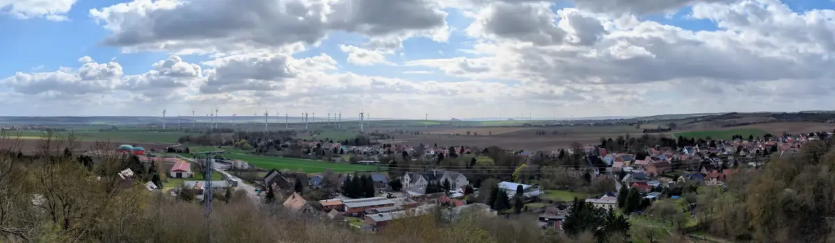 Vom Rand der Schildmauer sieht man direkt hinunter ins Dorf und dann weit über die Felder: Windräder, braune und grüne Äcker, und am Horizont die unverwechselbaren Silhouetten des Mansfelder Kupferbergbaus. Zwei kegelförmige Abraumhalden, die sogenannten Pyramiden, stechen heraus, dazu ein Förderturm. Ganz am Horizont, in südlicher Richtung, der Kyffhäuser mit dem Denkmal. An einem klaren Tag wie unserem war das alles scharf zu sehen.