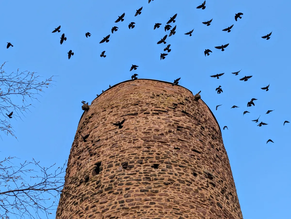 Die Vorburg ist frei begehbar, ebenso der Bereich entlang der Schildmauer. Der Bergfried ist unten quadratisch, mit einer Grundfläche von neun mal neun Metern, und geht dann in halber Höhe in eine runde Form über. Der Turm selbst war verschlossen – er gehört den zahlreichen Dohlen. Ein ganzer Schwarm saß auf dem Mauerwerk, flog immer wieder ein paar Runden um den Turm und kehrte dann auf dieselben Plätze zurück. Als wollten sie prüfen, ob wir auch wirklich wieder gehen.